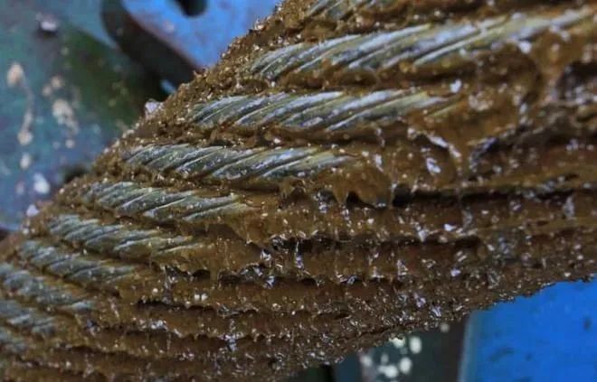 The internal damage of the wire rope is obscured by grease and dirt